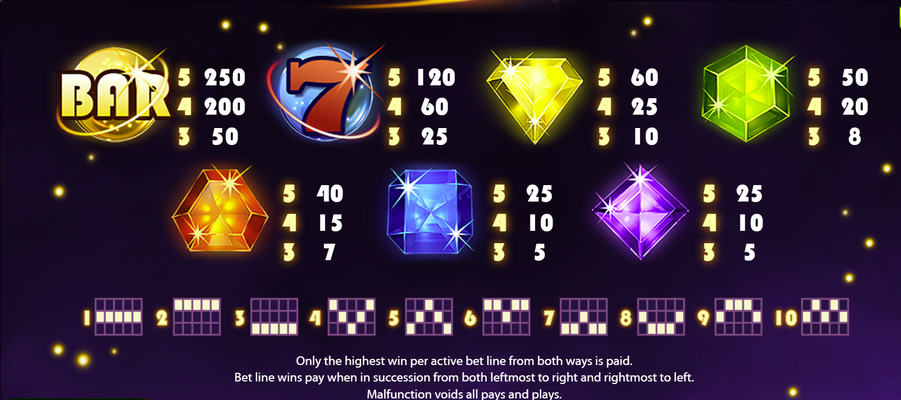 Starburst's iconic interface with vibrant gem symbols and cosmic background